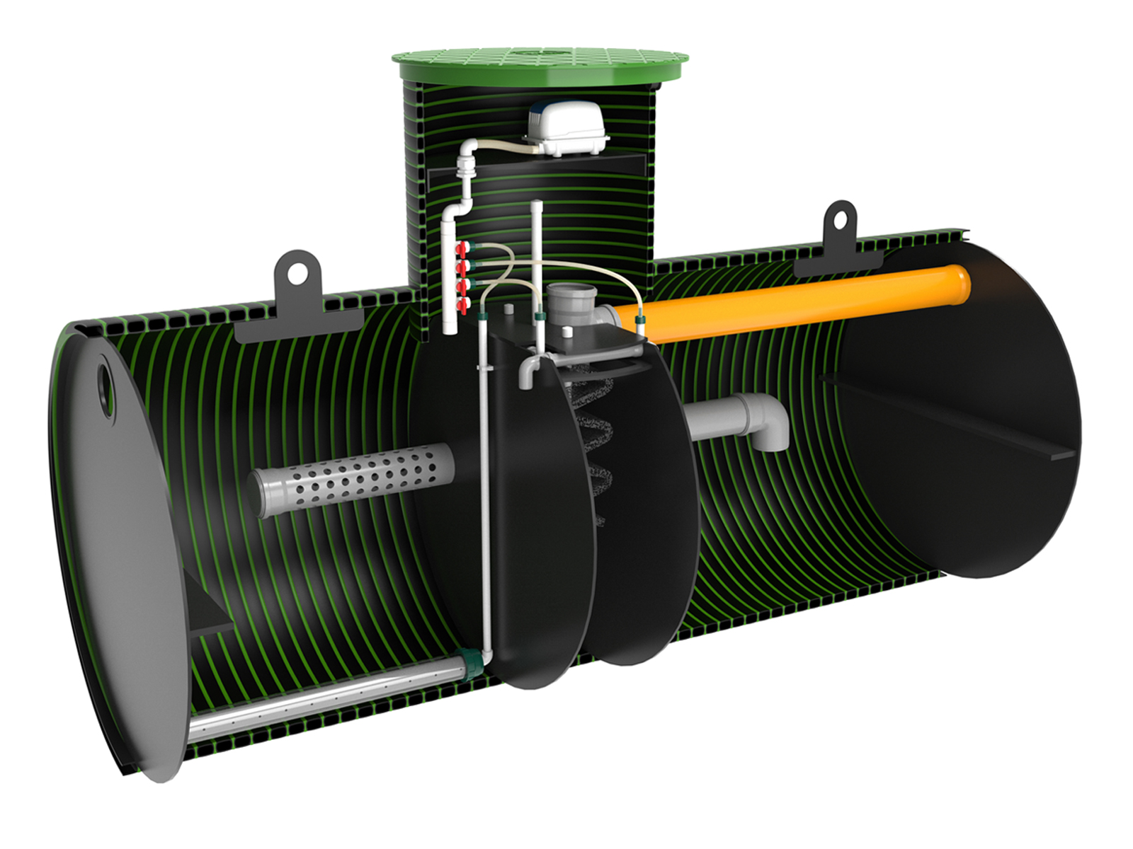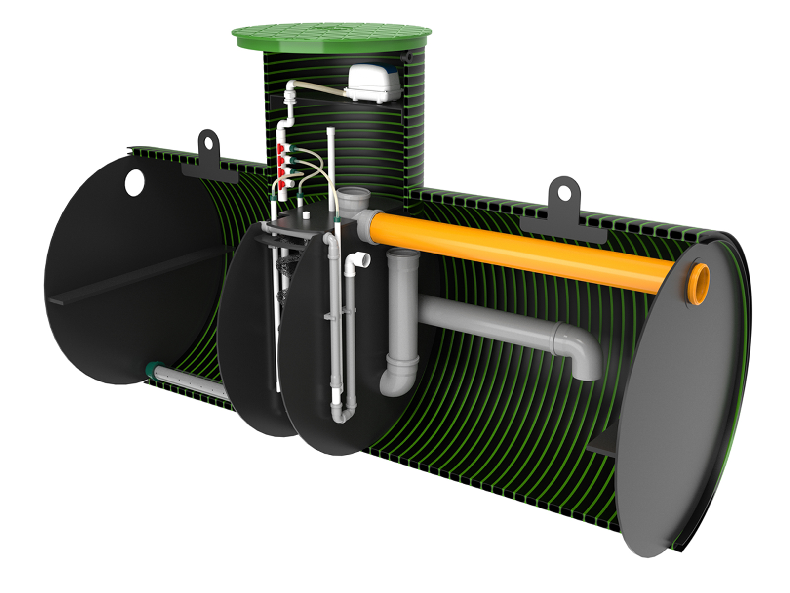 Горизонтальные станции биологической очистки KANN серии ECO имеют производительность от 400 до 900 л/сутки и рассчитаны на количество проживающих от 2 до 6 человек. Принцип работы септика основан не мелко-пузырчатой аэрации, которую создает аэрационная установка, поставляемая в комплекте. За счет подачи воздуха в станцию, а также дополнительных механизмов очистки происходит полная очистка стоков до уровня 98%. Полученная на выходе вода на выходе не имеет запаха, прозрачна и бесцветна. Такую воду можно дренировать в грунт.