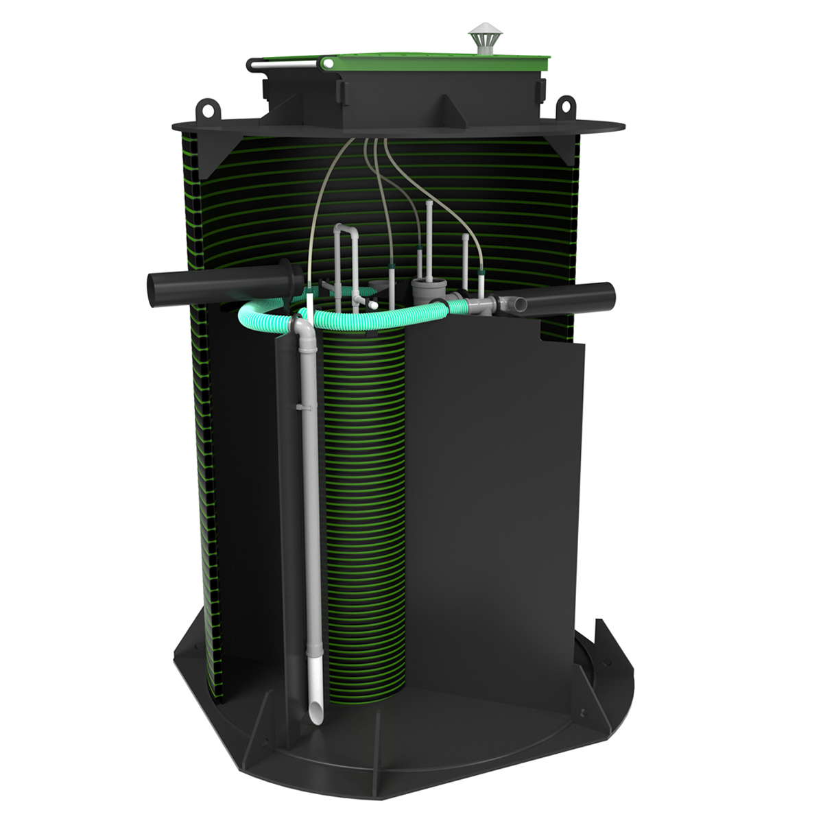 Станция представляет собой цилиндрическую емкость, разделенную на 6(шесть) технологических камер/зон, соединенных между собой самотечными переливами, а также предустановленными эрлифтами. Отведение очищенной воды осуществляется самотёчно.
