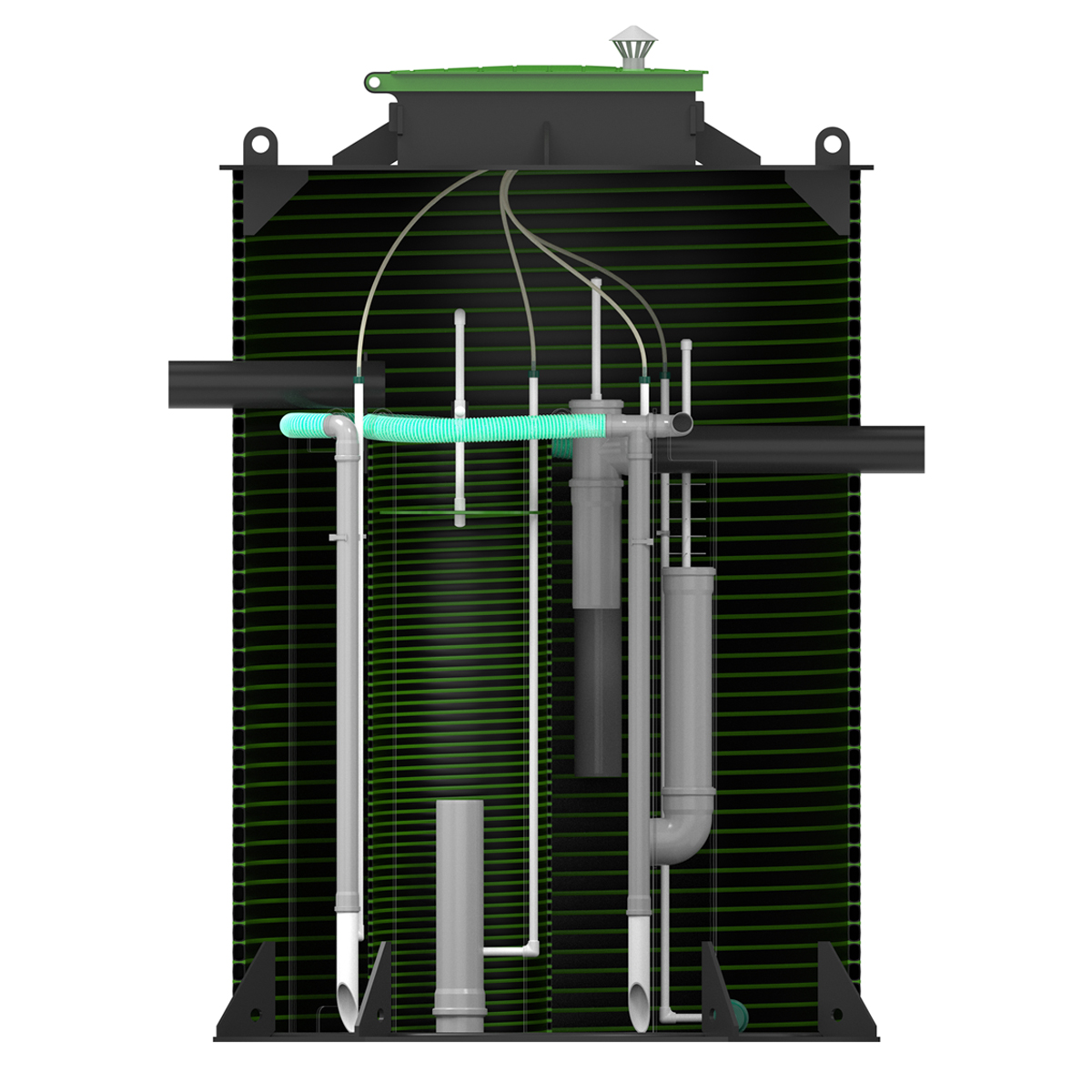 Станция представляет собой цилиндрическую емкость, разделенную на 6(шесть) технологических камер/зон, соединенных между собой самотечными переливами, а также предустановленными эрлифтами. Каждая станция предполагает возможность отведения очищенной воды при помощи самотечного водоотведения либо принудительно при помощи дренажного насоса (в зависимости от выбранной модели СБО).
