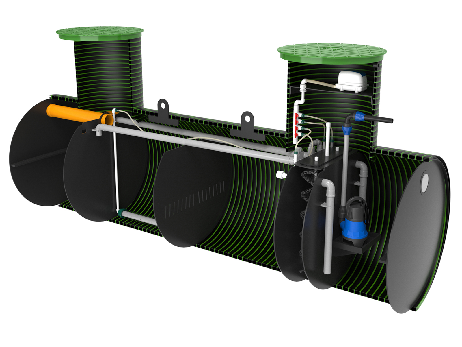 Станция представляет собой цилиндрическую емкость, разделенную на 5(пять) технологических камер/зон, соединенных между собой самотечными переливами, а также предустановленными эрлифтами. Каждая станция предполагает возможность отведения очищенной воды при помощи самотечного водоотведения либо принудительно при помощи дренажного насоса (в зависимости от выбранной модели СБО).