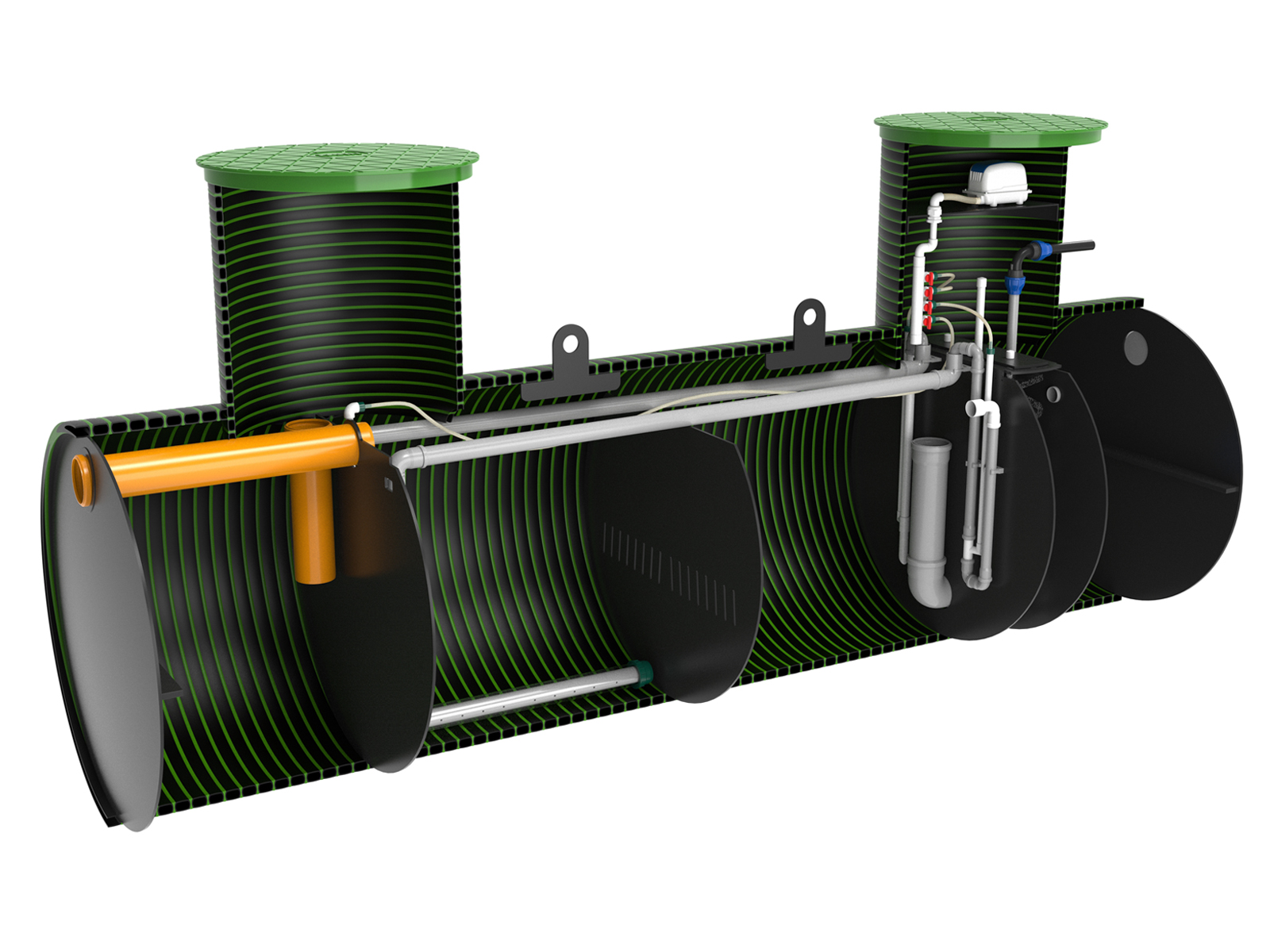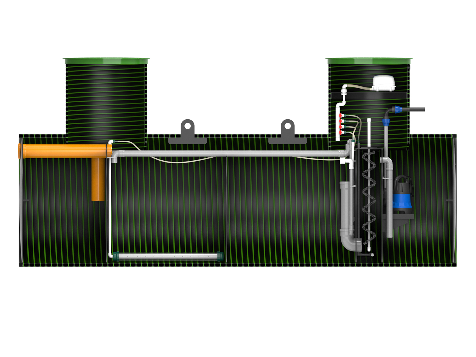 Горизонтальные станции биологической очистки KANNсерии ULTRAимеют производительность от 1000 до 2000 л/сутки и рассчитаны на количество проживающих от 5 до 10 человек. Принцип работы септика основан не мелко-пузырчатой аэрации, которую создает аэрационная установка, поставляемая в комплекте. За счет подачи воздуха в станцию, а также дополнительных механизмов очистки происходит полная очистка стоков до уровня 98%. Полученная на выходе вода на выходе не имеет запаха, прозрачна и бесцветна. Такую воду можно дренировать в грунт.
