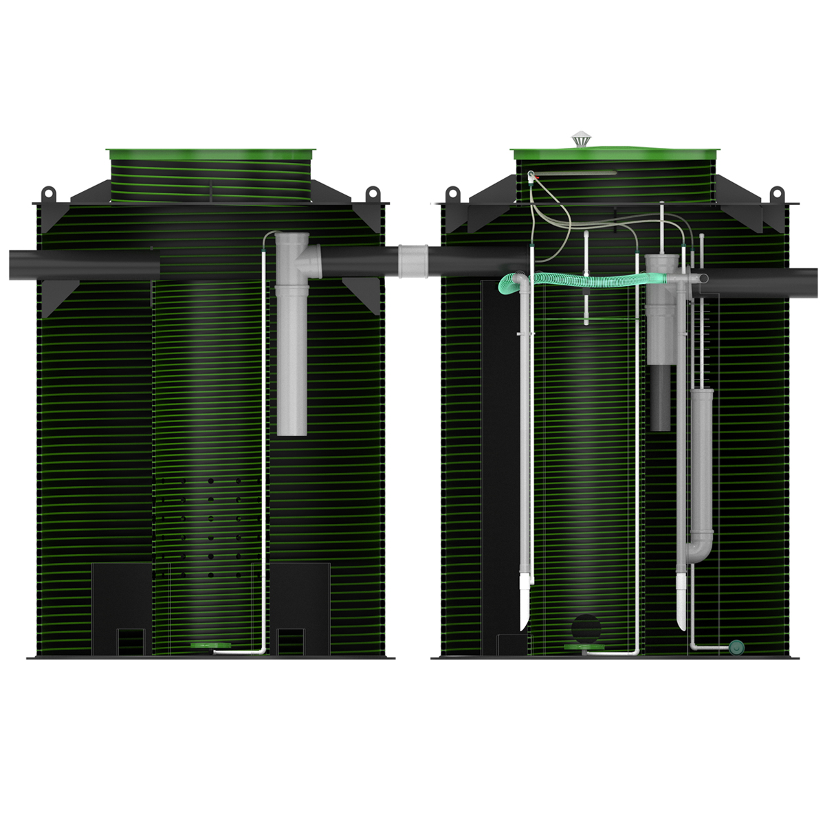 Станция представляет собой цилиндрическую емкость, разделенную на 6(шесть) технологических камер/зон, соединенных между собой самотечными переливами, а также предустановленными эрлифтами. Каждая станция предполагает возможность отведения очищенной воды при помощи самотечного водоотведения либо принудительно при помощи дренажного насоса (в зависимости от выбранной модели СБО).