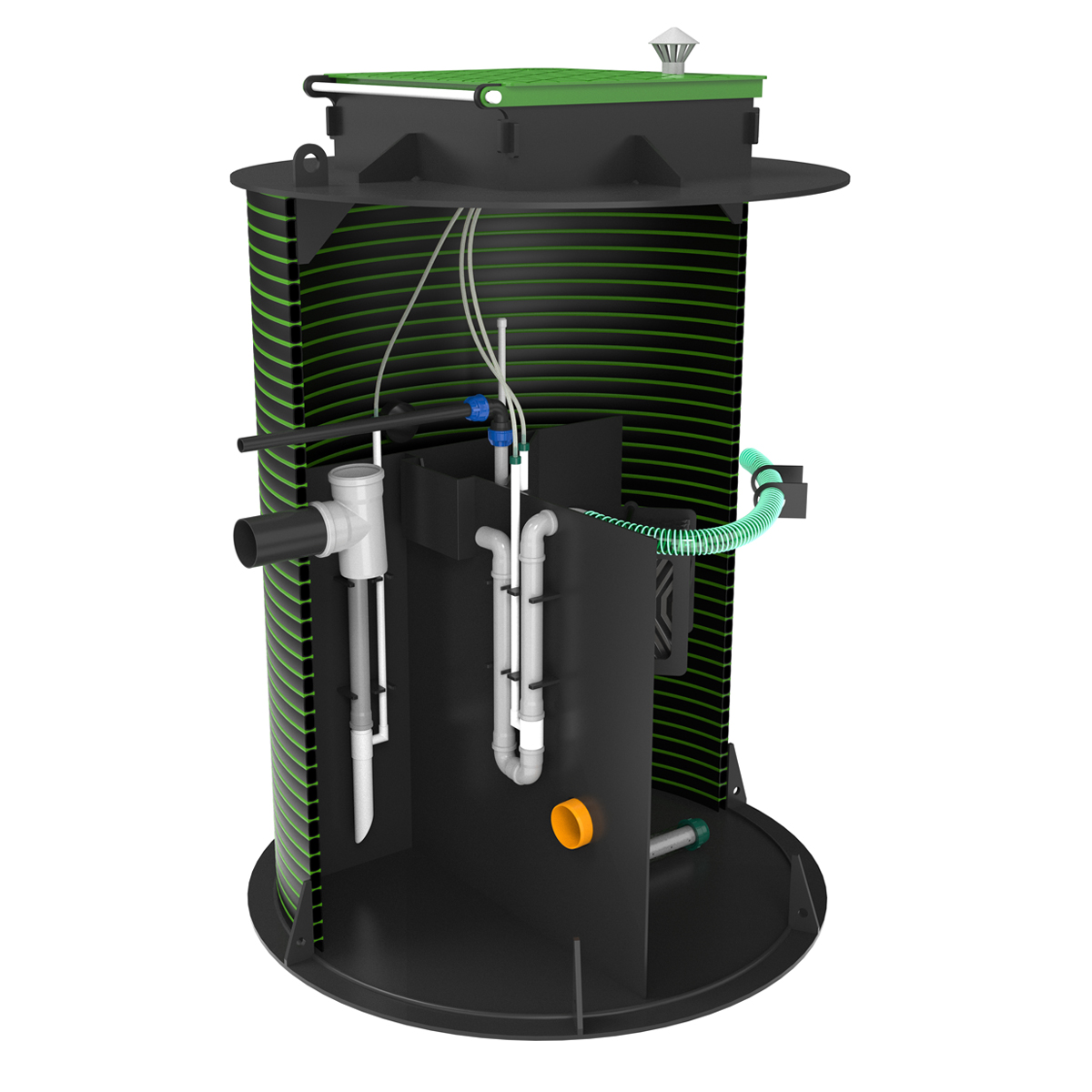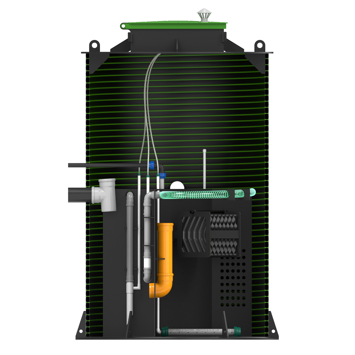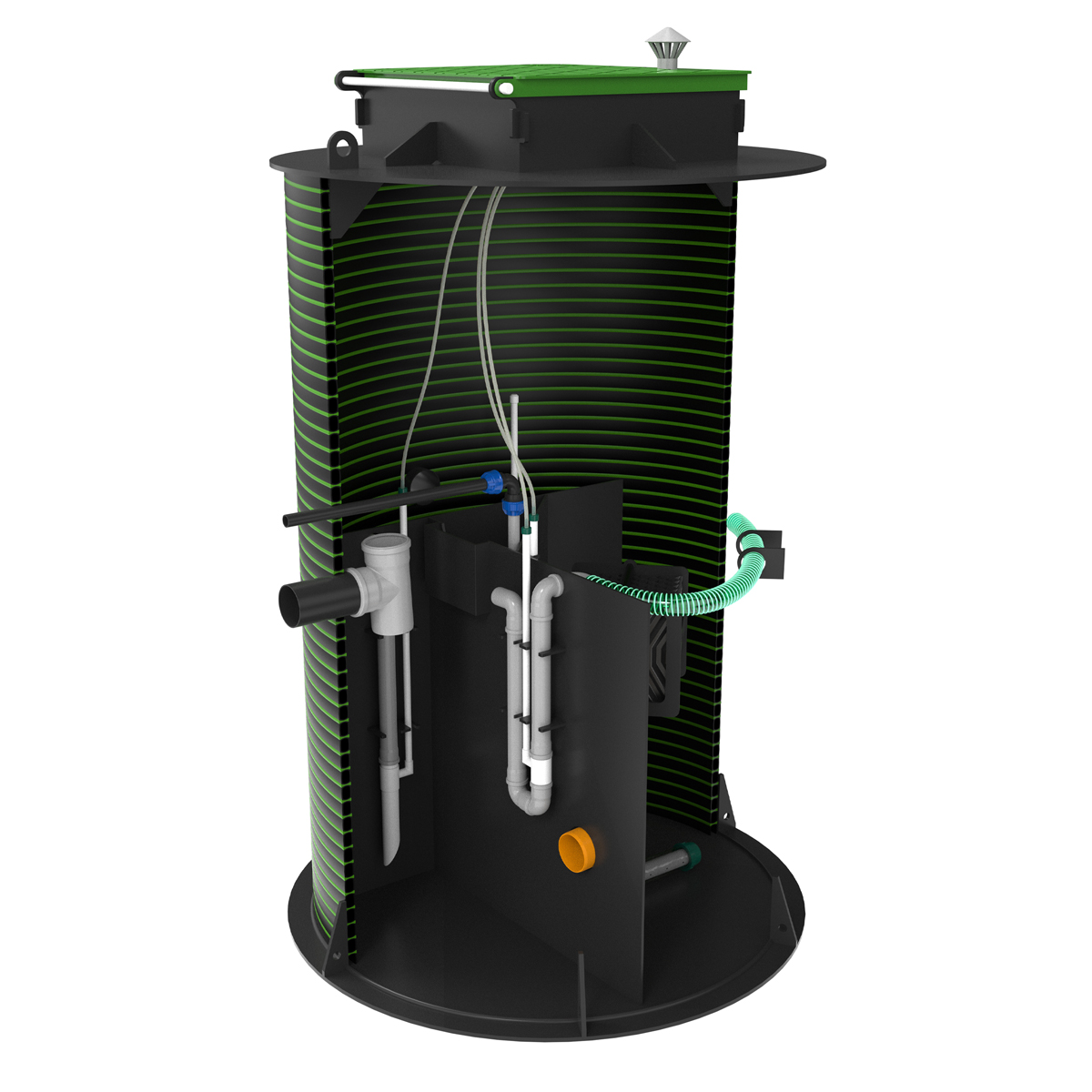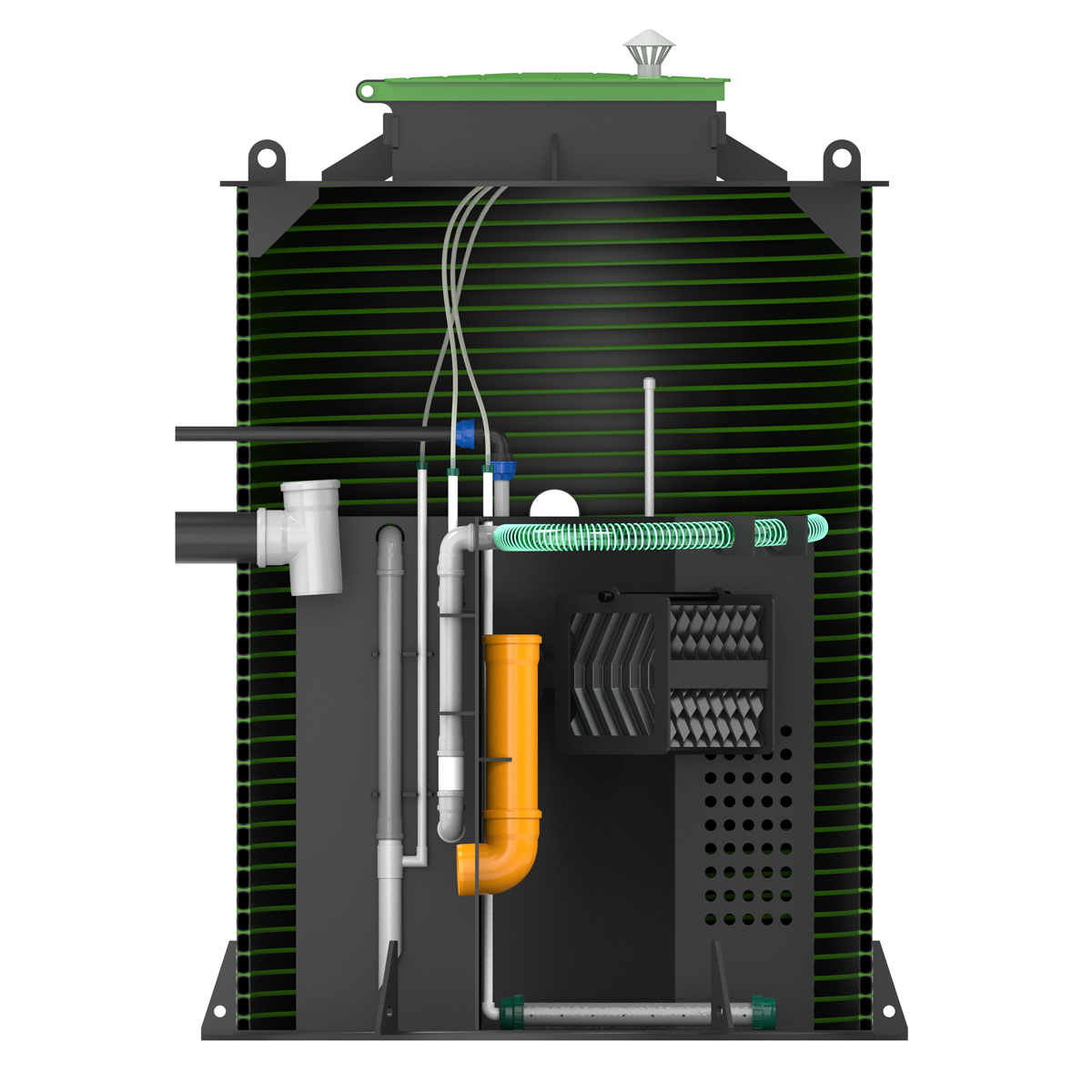 Станция представляет собой цилиндрическую емкость, разделенную на 4(четыре) технологические камеры/зоны, соединенных между собой самотечными переливами, а также предустановленными эрлифтами. Каждая станция предполагает возможность отведения очищенной воды при помощи самотечного водоотведения либо принудительно при помощи дренажного насоса (в зависимости от выбранной модели СБО).